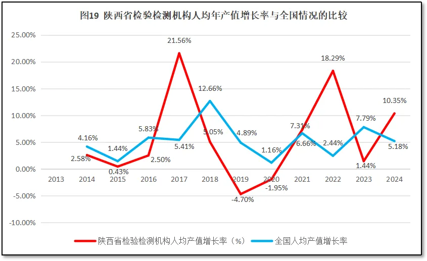 再来看陕西省检验检测机构人均年产值增长率与全国人均年产值增长率的比较,如图19所示。