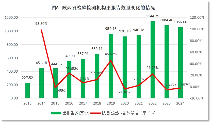 从图8来看,过去12年,陕西省检验检测机构对外出具的检验检测报告数量波动式增长的特点,2014年比2013年有较大增长,但2015年出现下降;2019年较2018年有较大增长,但2019-2021年又出现下降;2022年达到1144.79万份的峰值,此后最近两年报告数量再次下降,到2024年度出具的报告数量为1056.6万份,是2013年出具报告数量的4.64倍。从增长率曲线来看,刨除头两年数据误差大之外,从2015-2023年的年均增幅为11.26%。年度最高增幅出现在2019年,达到45.52%的增幅,2016年和2022年也出现过超过20%的增长高峰,不过最近两年的增长率均为负值。